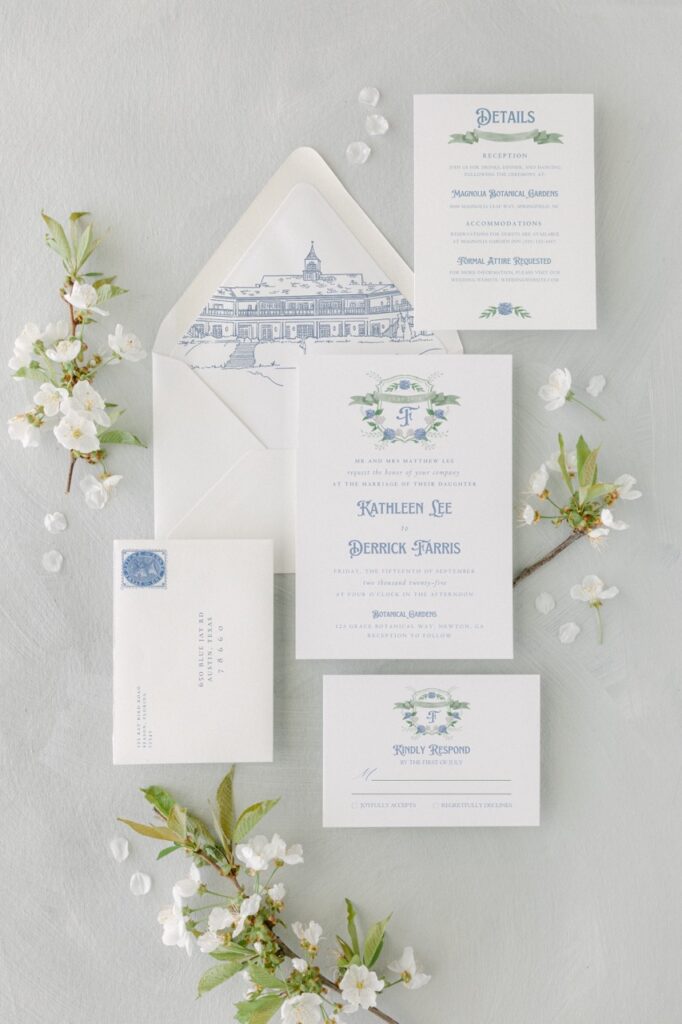 A custom illustrated venue painting serves as a charming envelope liner, adding a personal and artistic touch. The suite is finished with soft ivory ribbon and a blush wax seal, creating a cohesive and dreamy presentation perfect for a refined garden or historic estate wedding.